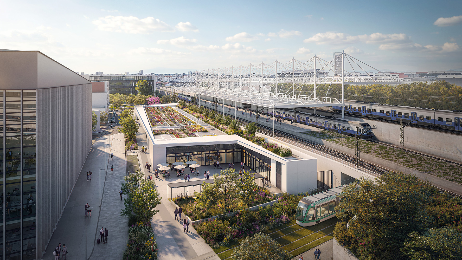 Par un jeu de plis, alternance de vides et de pleins, il permet de rendre immédiatement intelligibles les fonctions de la gare, de qualifier une nouvelle place publique et de créer une dynamique d’ensemble.