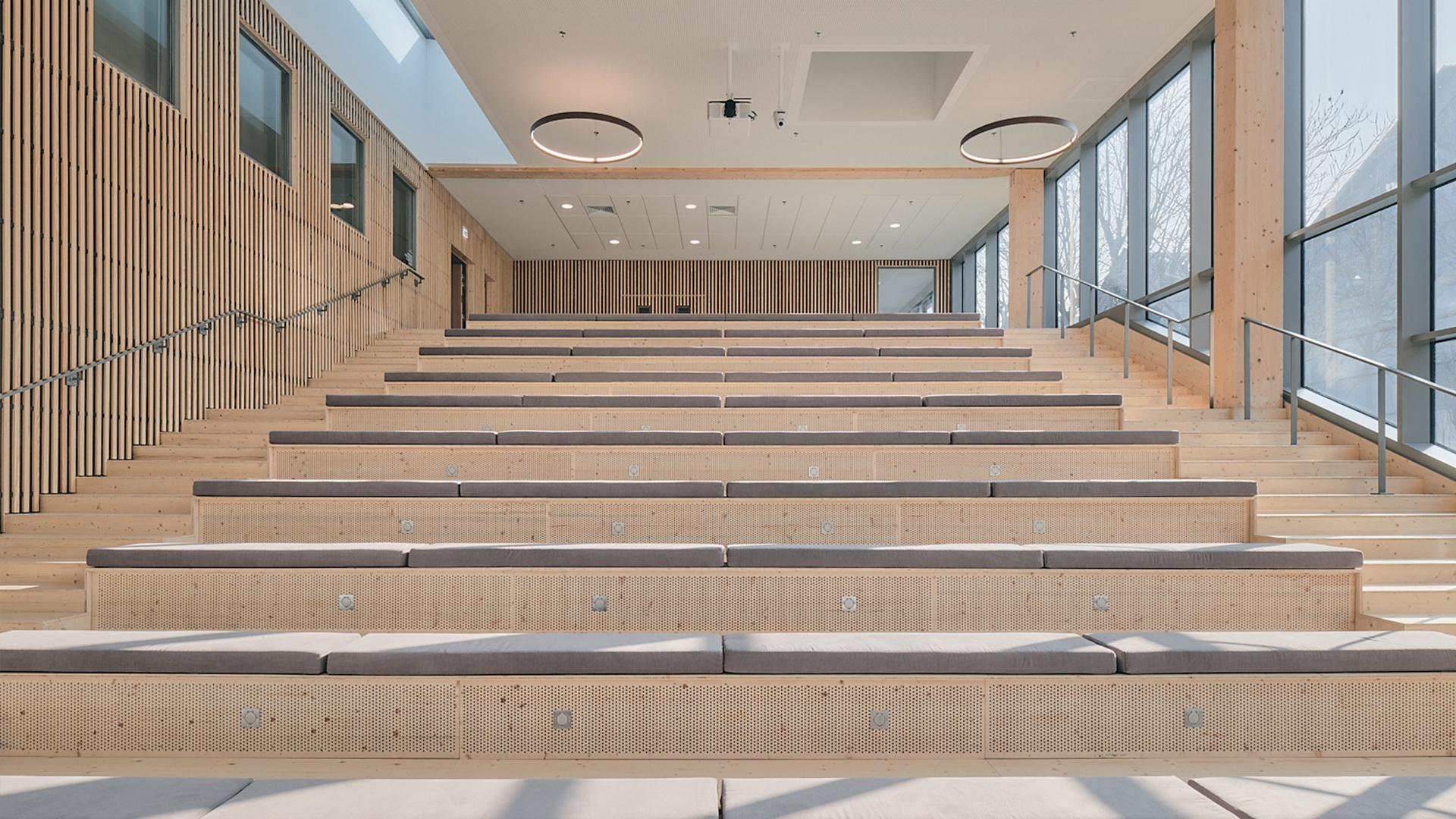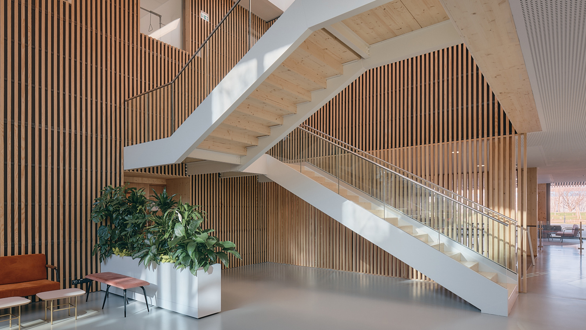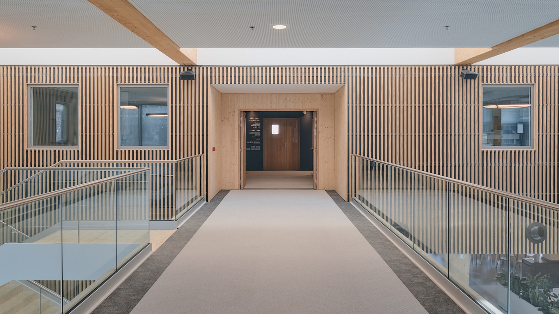 Aussi performant sur le plan fonctionnel, le bâtiment déploie en outre, sur plus de 6000 m², une grande diversité de fonctions articulées autour d’un espace-clé, ouvert à quantité d’usages : son agora. Un véritable point nodal vers lequel convergent 13 laboratoires, des bureaux, des salles de réunion ou encore des espaces de restauration ; lieu d’échange et d’interaction qui résume bien le souci de cohérence et de générosité qui a guidé l’ensemble du projet.