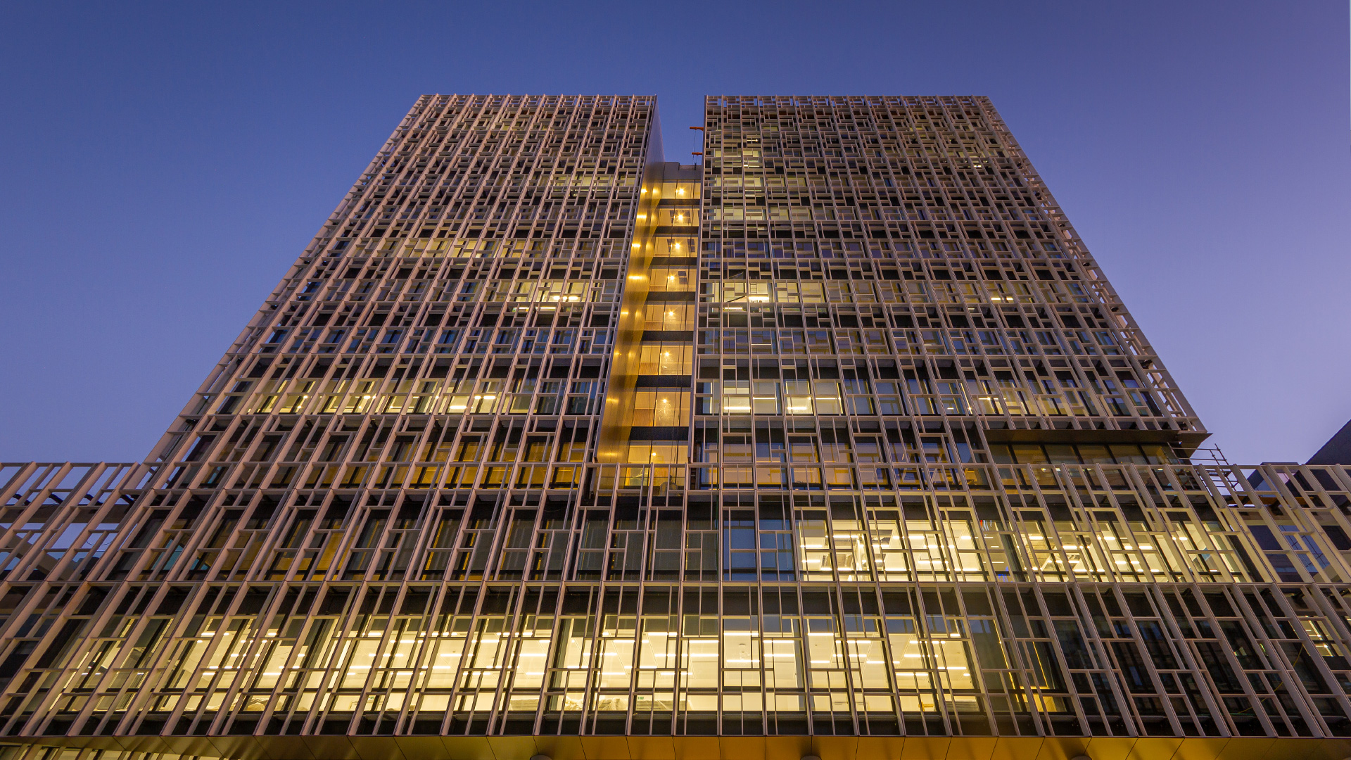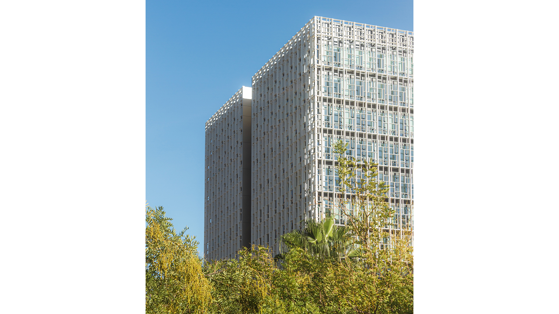 - confort des usagers et réduction des consommations : dispositif passif adapté de protection de la façade par une double-peau en BFUP faisant brise-soleil (densification plus ou moins importante selon les niveaux et orientations)